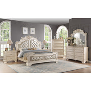 Introducing the Quinn Bedroom Collection, an opulent ensemble that exudes timeless elegance with its exquisite pearl finish. This bedroom set transforms your space into a sanctuary of luxury and sophistication. Each piece in the collection is adorned with intricate nail head trim detailing, adding a touch of refined craftsmanship against the luminous pearl backdrop. The focal point of this collection is the tufted upholstery headboard, a sumptuous centerpiece that seamlessly merges comfort and style. Meticulously crafted, the Quinn Bedroom Collection is a perfect fusion of classic allure and contemporary design, offering a harmonious balance of aesthetics and functionality. Immerse yourself in the enchantment of this collection, where the pearl finish, intricate nail head trim, and tufted upholstery headboard converge to create a truly indulgent and timeless bedroom retreat.
